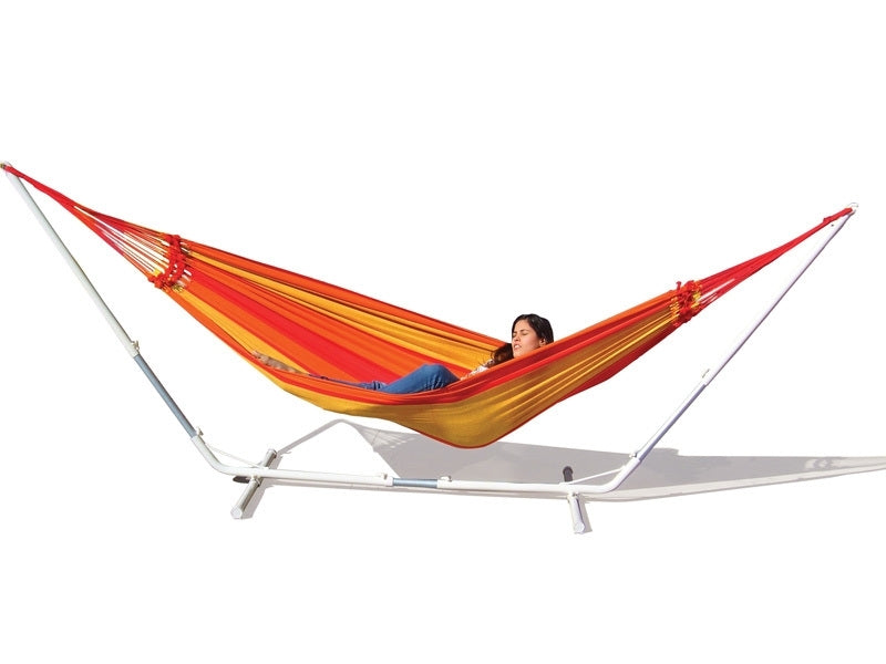 The Adjustable Hammock Stand Frame from Hammock Co is the perfect freestanding set up for your Hammock in the backyard or to take camping. This hammock stand is designed to suit all kinds of hammocks. It has a 150kg weight-rating and is safe for 2 people The stand features a sturdy sturdy leg design and steel construction. This hammock stand is easy to assemble, use and maintain. Ideal for indoors, decks, backyards and camping. Weight 16.5kg. Dimensions: 350cm L x 100cm W x 130cm H. Comes with a 1 year warranty. (Hammock not included stand only).