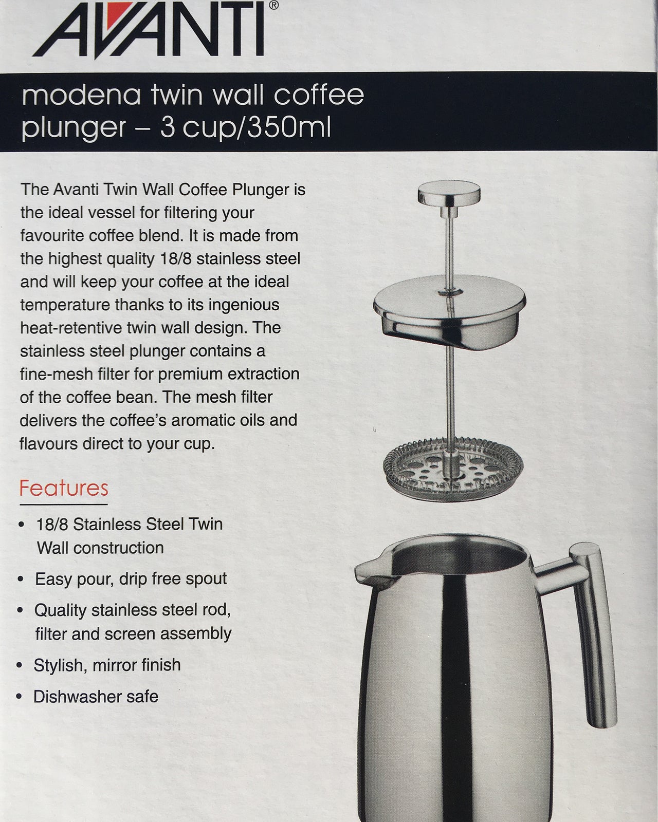 The Avanti Twin Wall Coffee Plunger 350ml is the ideal vessel for filtering your favourite coffee blend. It is made from the highest quality 18/8 stainless steel and will keep your coffee at the ideal temperature thanks to its ingenious heat-retentive twin wall design.