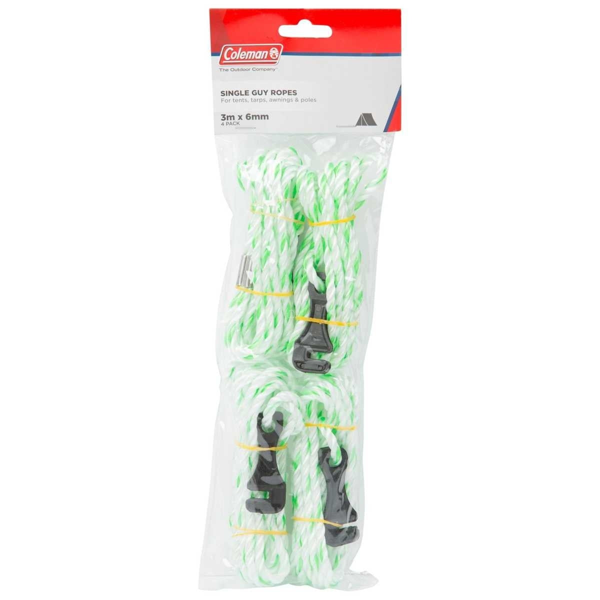 Coleman Single Guy Ropes 4 pack are great to have in your kit when you head outdoors. Great for securing your tent, tarp or gazebo. They come in a 4 pack with each guy rope being 3m long X 6mm thick. guy rope for securing tents. They are wear resistant, sturdy with the waterproof rope being guaranteed not to rot or mildew.