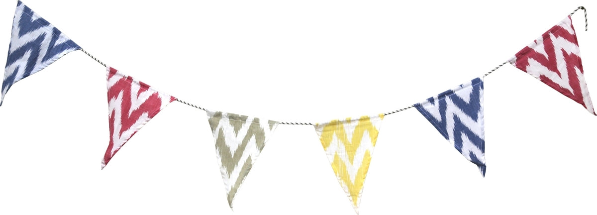 Bunting can also be used for decorating backyard gardens, parties, kids rooms and special events. This bunting features Ikat pattern cotton fabric flags, colours may vary.