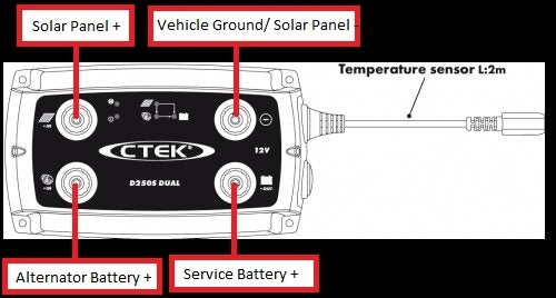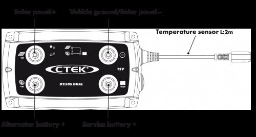Charging automatically starts as soon as DC energy is provided to the charger, such as from alternators when a vehicle is started or from solar panels when connected. When Solar is connected the CTEK D250S operates as a MPPT Solar regulator. The D250S also has a temperature sensor which ensures optimal charging voltages at all temperatures. The CTEK D250S incorporates a Voltage Sensing Relay (VSR), therefore, when your battery drops to 12.5v the VSR will automatically isolate and protect your starting battery from discharging, leaving you a full charge start your vehicle at all times.