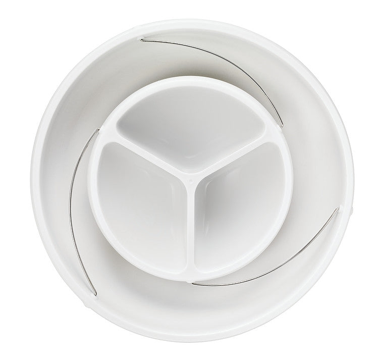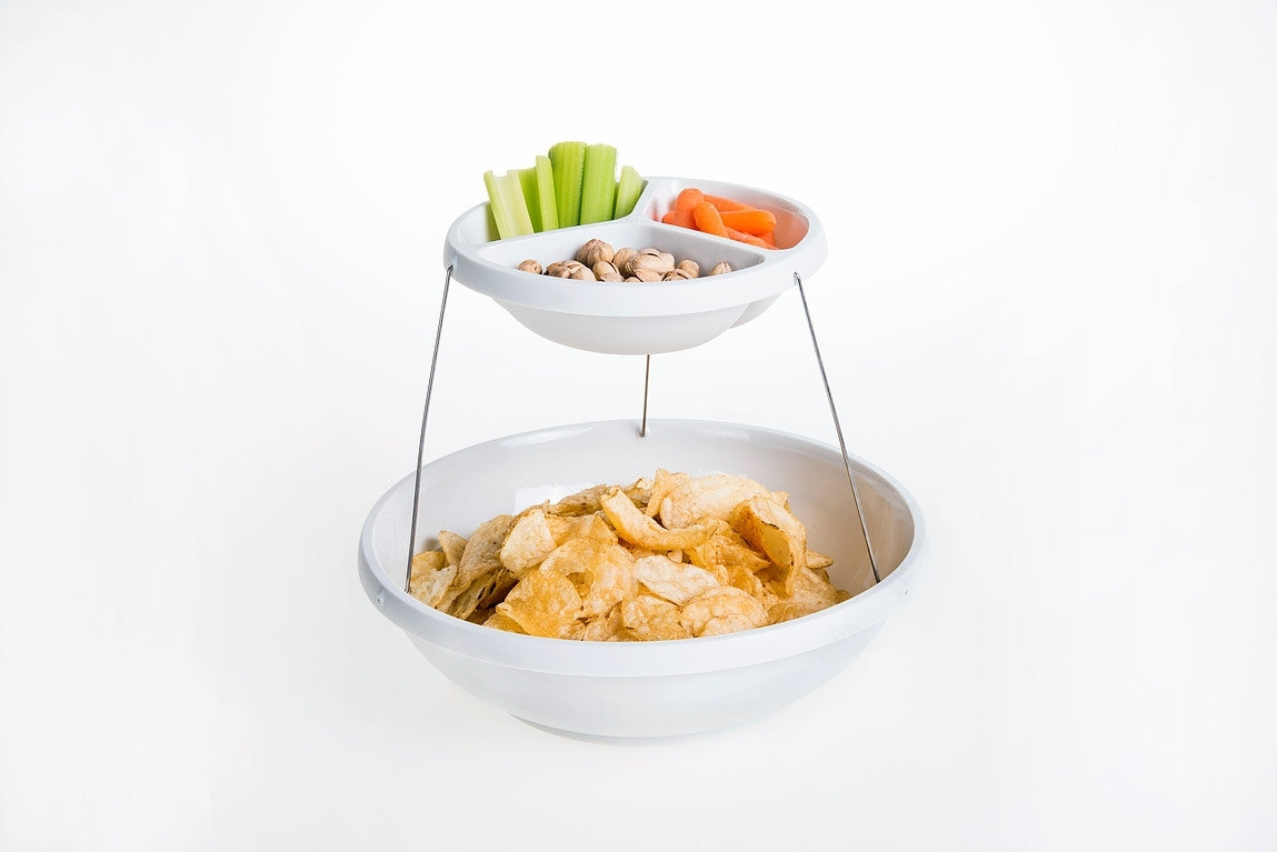 The bowl assembles and collapses in seconds with a simple twist. On the bottom there is a large bowl for your favourite nibbles, chips, crackers, breads, fruit etc and on the top is a partitioned top bowl with three sections for dips, nuts, olives, lollies whatever you like! Great for afternoon nibbles, snacks, and fruit at the campsite.