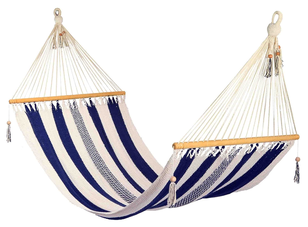 This navy blue and white striped hammock is the picture of luxury, but it doesn't just please the eye. Hand made in Nicaragua, the double weave technique makes it extra supportive and comfortable. Made from 100% cotton, it is super soft to touch. The spreader bars are made from plantation hard wood, and the hammocks are secured under fair trade principles, so you can lay your conscience to rest. The quality of these hammocks is outstanding: made from 100% cotton, plantation hard-wood and cast alloy rings. Large hammock size, great for relaxing or sharing.