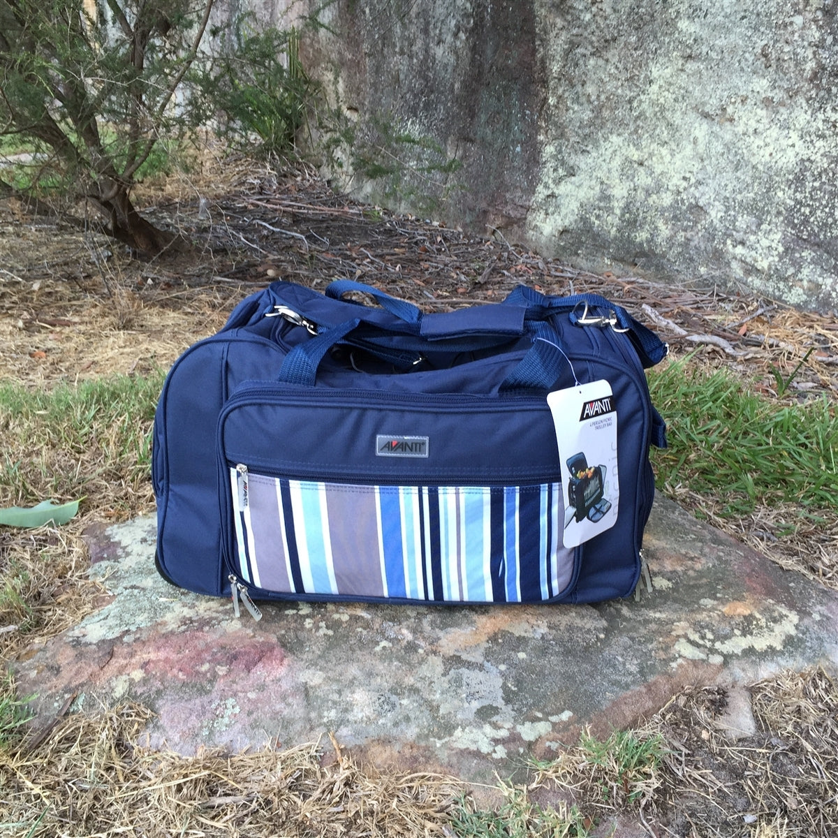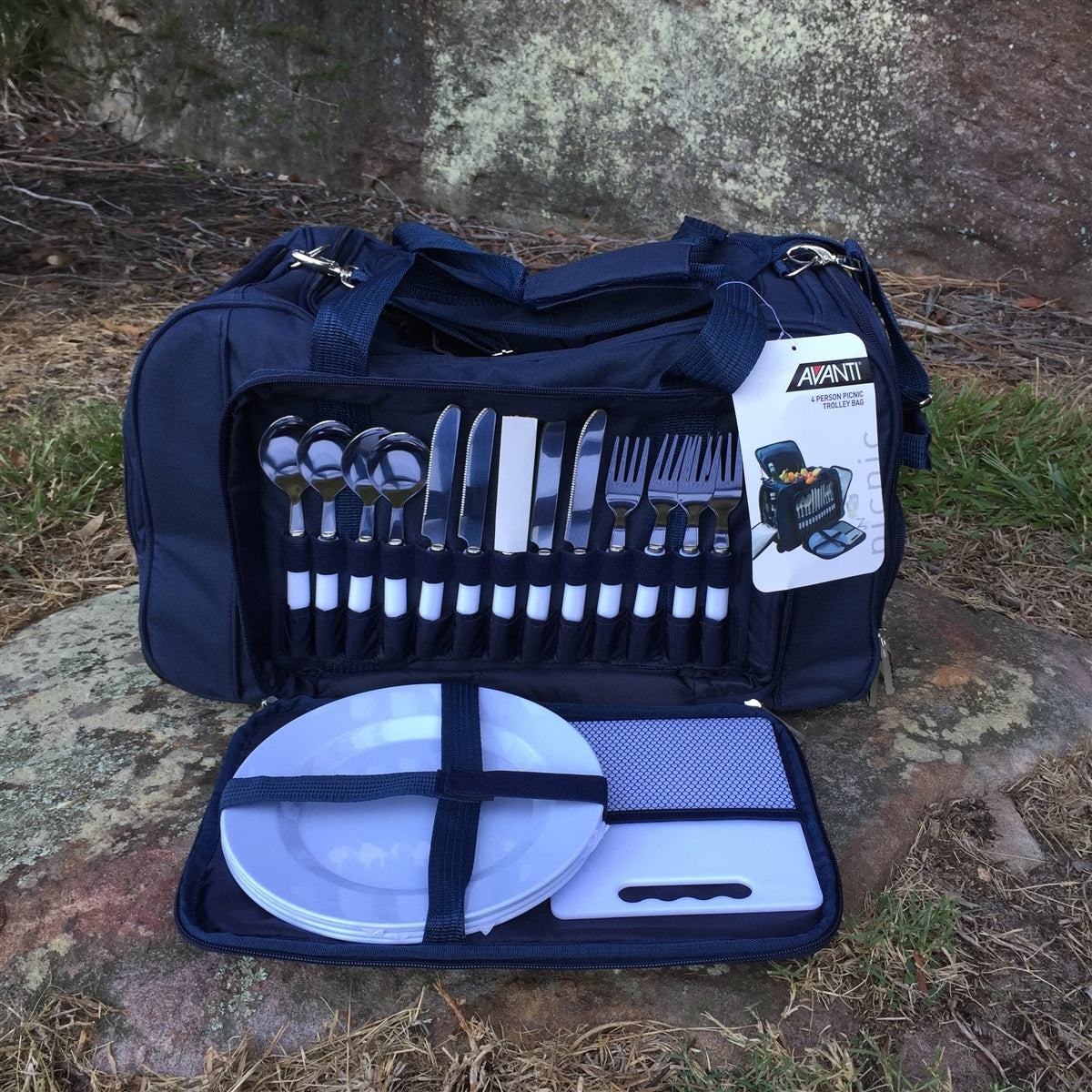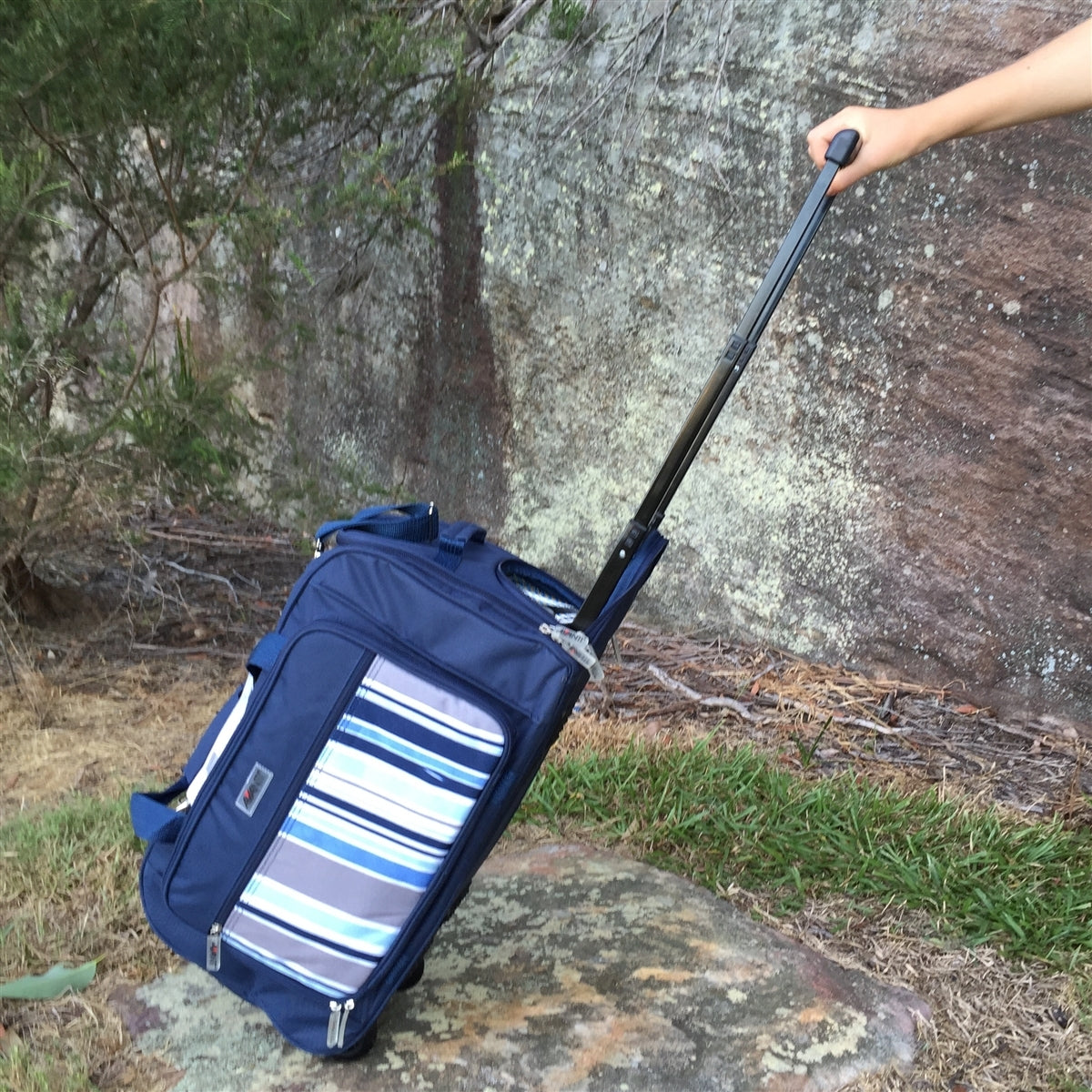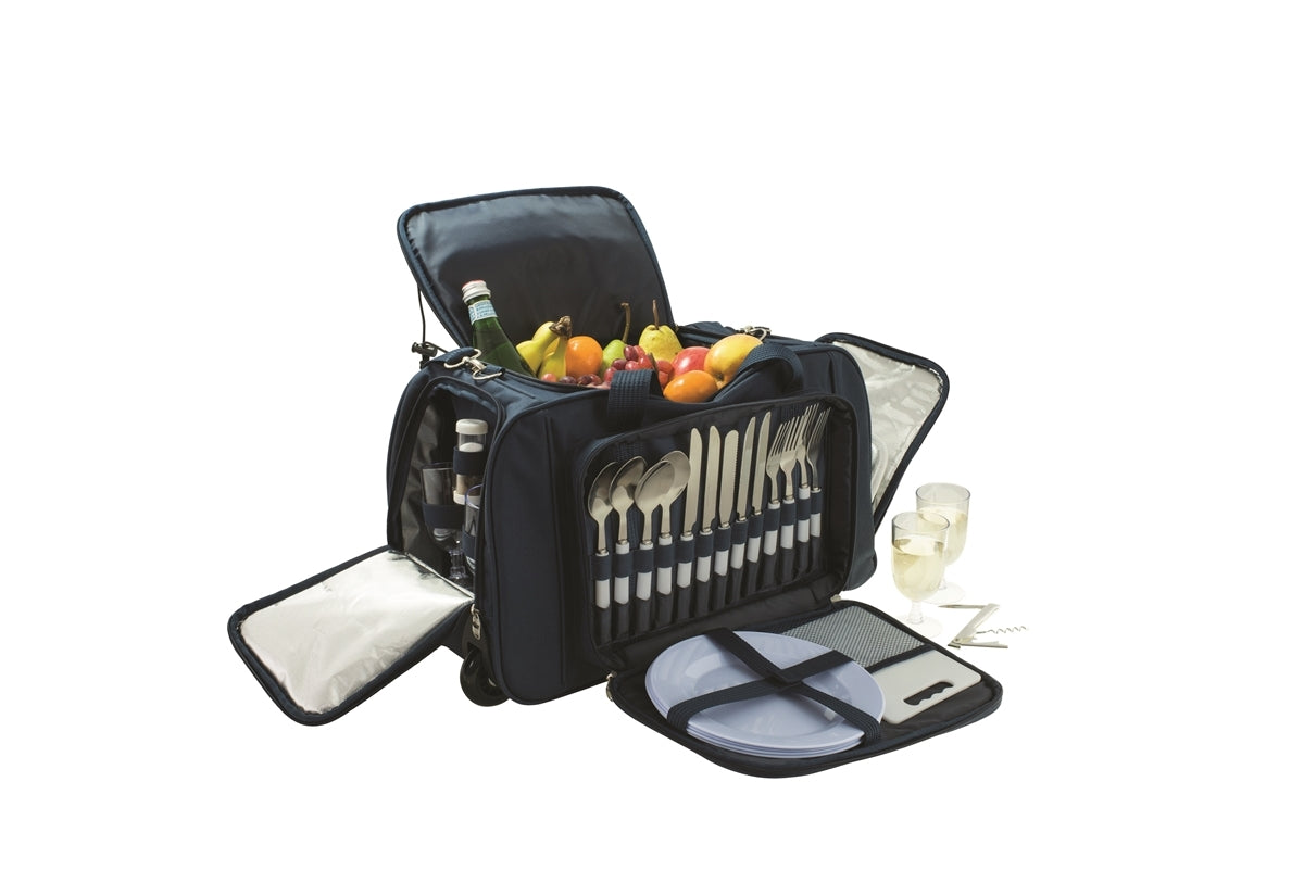 The Avanti 4 Person Picnic Trolley Bag is great for picnic lovers. The design shape is similar to a duffle bag with easy access to all contents. This stylish practical bag is very easy to transport with options for carrying and wheeling. It has 2 durable wheels on the base and a retractable trolley handle that stows away in a small side pocket, plus a handy grab handle on the side. It also has a long adjustable padded shoulder carry handle that can be detached as well as two smaller carry handles. The bag features a large insulated cooler compartment for food and drinks with a zippered lid, that has additional storage, a picnic blanket or other items can be stowed on top.