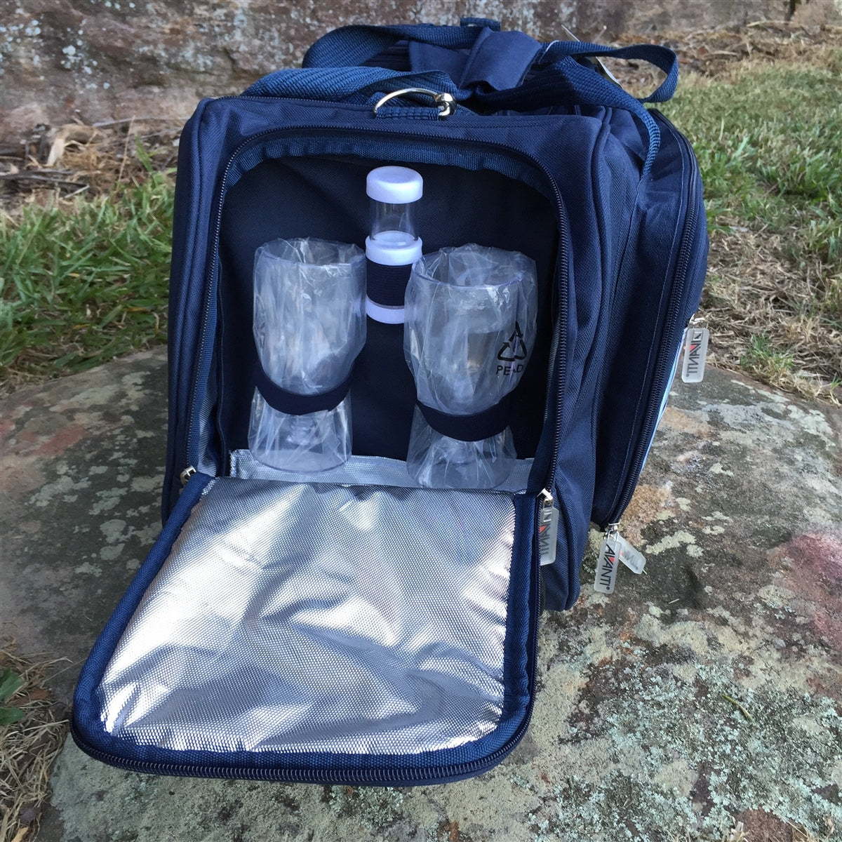 The cooler lining is removable for easy cleaning. The zippered side and front compartments contain picnicware for 4 people including 4 x white plastic plates, 4 x plastic wine glasses, 4 x white handled cutlery sets (knives, forks & spoons), salt & pepper shaker, 1 x cheese knife, 1 x cutting board and 1 x bottle opener. Plate size 22.5cm diameter. There is also another small zippered front pocket for additional storage.