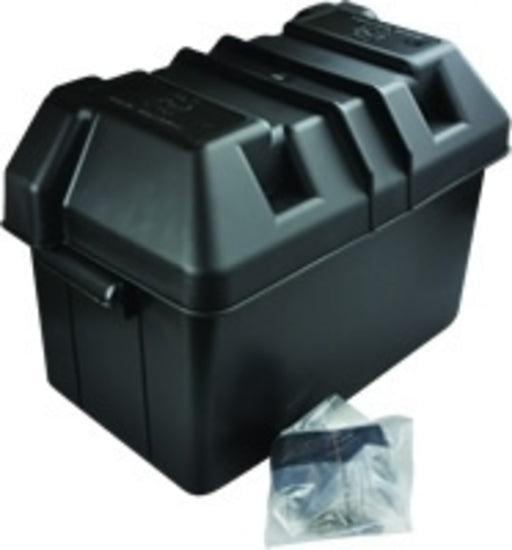 Large size polypropylene battery box with strap. This battery box is a large size and can house batteries up to appx. 105amh. No accessories included with this box, however, add additional accessories as you like such as surface mount outlets. The battery box spacer is compatible with this large battery box which means you could either hold a larger battery (up to appx. 130amh) or have more room to add additional accessories such as more outlets or a dual battery charger.