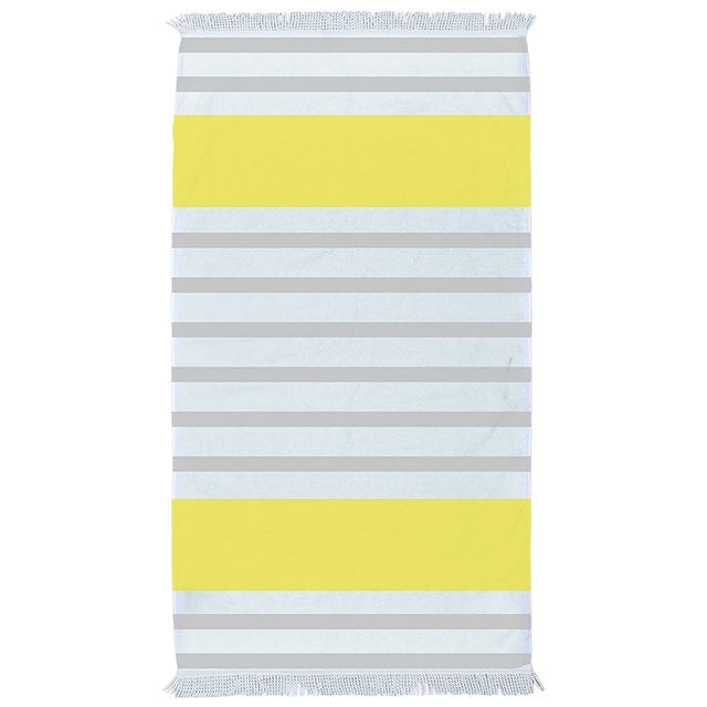 Luxurious 100% Egyptian Cotton Beach Towel from Bambury. Horizon stylish vibrant yellow with white and grey stripes design for a classic, fun summery look. Made in a luxurious weight 450gsm cotton jacquard velour and generous size 95cm x 175cm, it is super soft, durable and excellent quality. Designed for comfort and absorbency, this attractive fringed beach towel will be a favourite for the beach, pool and holidays.