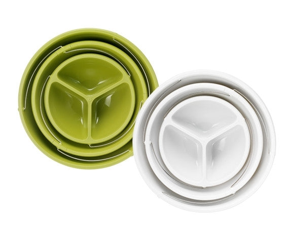 When collapsed, the bowls are nested and held securely in place by hidden magnets for easy and compact storage.