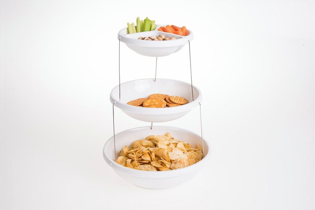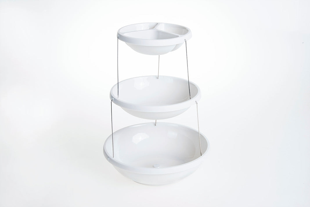 On the bottom there is a large bowl 28cm diameter for your favourite nibbles, chips, crackers, breads, fruit etc, in the middle there is another bowl 23cm diameter and on the top is a partitioned top bowl 18cm diameter with three sections for dips, nuts, olives, lollies whatever you like! Great for afternoon nibbles, snacks, and fruit at the campsite.