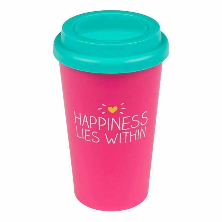 The Happy Jackson Travel Mug consists of a double-walled, durable, plastic body, perfect for insulating your tea or coffee all year round. Large capacity of up to 414ml or 14oz and with the "Happiness Lies Within" double-meaning message, you'll be inspired when enjoying your tea or coffee anytime throughout the day. A handy and fun camping and travelling accessory. Hot pink and bright green colours, size: 15.5cm (H) x 9.5cm (D).