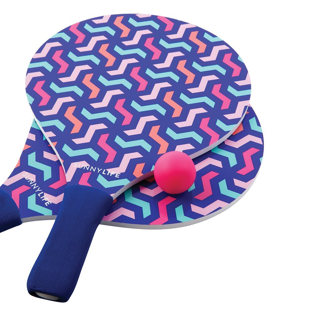 Beach Tennis anyone? Have fun in the sun with these cool blue and white beach paddles from Sunnylife! This beach tennis set comes in a carry bag and includes two hardwood bats, sporting non-slip neoprene handles and two rubber balls. Keep the kids (and adults) entertained at the campground, beach, park and backyard with this popular game.