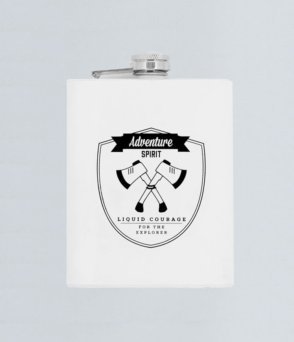 Stainless steel hip flask, coated in white with adventure spirit emblem. Size: 10cm and comes in a white carboard box. Makes a great gift!