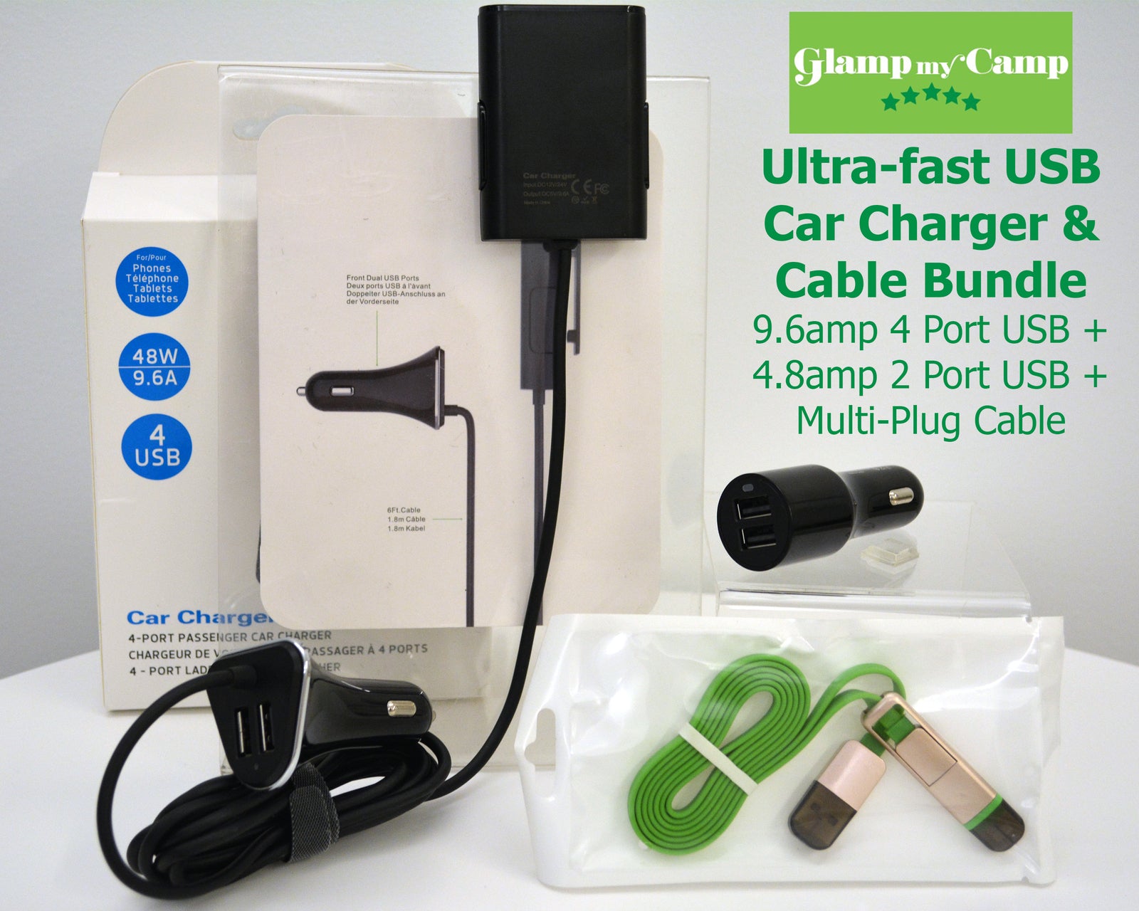 Our Ultra-fast USB Car Charger & Cable Bundle is a superb quality, feature packed and great value. Included in this value bundle are a 9.6amp 4-Port USB Charger, a 4.8amp 2-Port USB & Multi-Plug (Micro USB & Lightning) Charging Cable. Perfect for road trips or your USB camping charge station. The whole family can stay charged on the road!